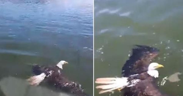 在加拿大穆斯島附近的芬迪灣,漁船上有三個當地人正在捕撈蛤蜊,沒想到他們卻看到水面上有一隻老鷹在游泳!牠一直奮力揮動翅膀,看得出來是想要讓自己能夠再次飛起來!