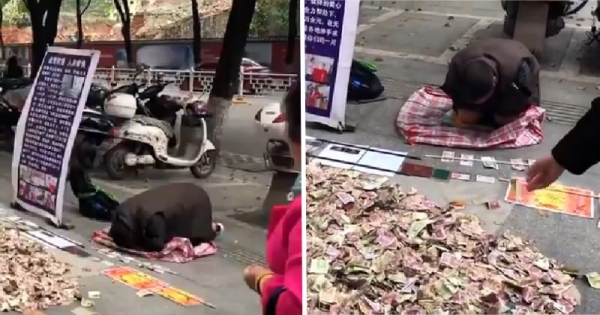 不知道如果大家走在路上,看見有乞丐在路邊討乞,會是什麼反應呢?有人會直接走過,也有先人會好心的掏出身上的零錢或是鈔票,捐給乞丐幫個忙,但我們一般看到的乞丐都是穿著破爛陳舊,也沒什麼錢的印象,只是現在街上居然出現有把鈔票直接撒滿地,堆成鈔票山向人討乞的事發生!