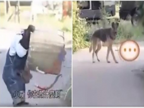 猩猩「小龐」見眼前有大狗狂吠不敢前行,沒想到下秒竟「鑽進」成功穿越了,笑慘啦!