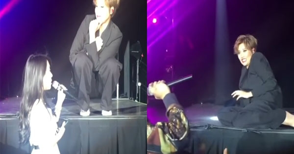 這個時候衝出一位男粉絲把麥克風接過,只見他很有自信的開始開口唱歌,而一旁的A-Lin卻被嚇到倒在舞台上,用無法置信的表情看著這位高歌的男粉絲。