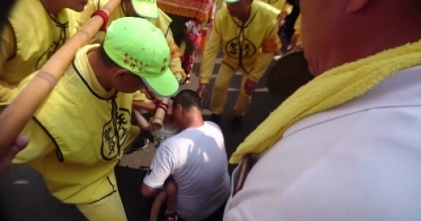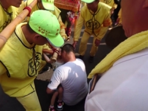 由於不知道媽祖會經過哪裡,所以想要鑽媽祖神轎的信徒只能在太陽下苦苦地等待媽祖,就像影片中這名男子,他緊緊抱著一歲的兒子,跪在地上希望可以以祈求媽祖保佑!結果原本沒有要經過的媽祖,在這時候竟然改了方向,直直朝這對父子走過去,而且還在他們的頭上停留了將近6分鐘,讓一旁的信徒不停喊說「媽祖來了」「媽祖加持」
