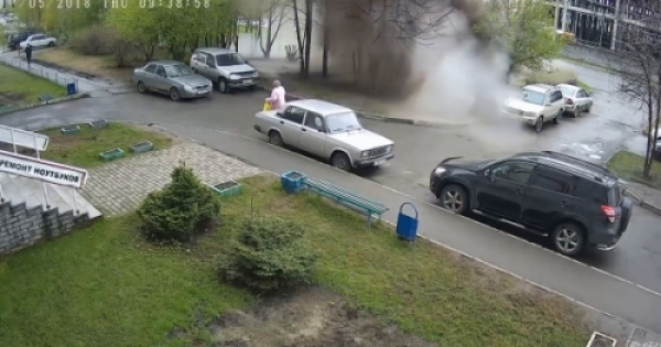這影片是在俄羅斯的一個小城鎮所拍攝到的,影片看起來是個很平和的小鎮,老奶奶一早起床散步完準備回家,想不到就在這時候...突然「碰」一聲!