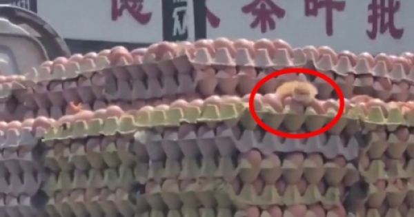 開車開到一半,看到隔壁雞蛋車裡竟然「孵出小雞」下一秒更驚人的事情發生,讓大家冷汗狂流直呼:好毛!
