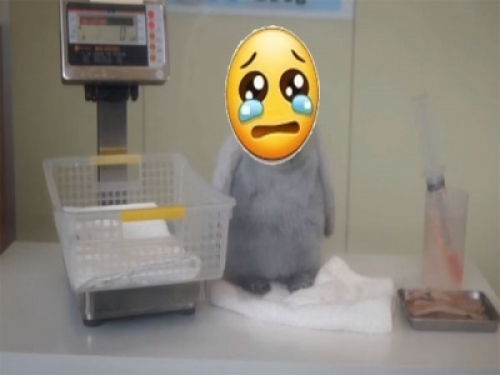 無論企鵝寶寶內心如何的吶喊,還是被放到了體重計上,看牠不停地想要掙脫逃跑,就是不願意好好配合量體重。