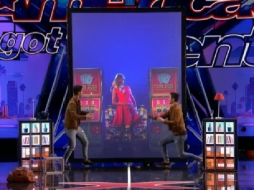 但精采的還不只是這樣,東尼跟他的弟弟喬丹,開使用舞台上任何道具不停塞進投影幕,而且塞進去投影幕哩,在投影幕裡的女子竟然也可以拿到該物品,然後神奇的事情就發生了!