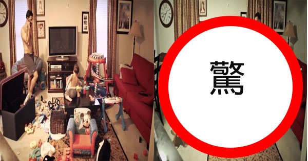 打鬧了2個小時之後,客廳變的殘亂不堪彷彿打過仗一樣,只見到爸爸接了一通電話後,兩父子開始瘋狂的整理,並把所有物品歸位。