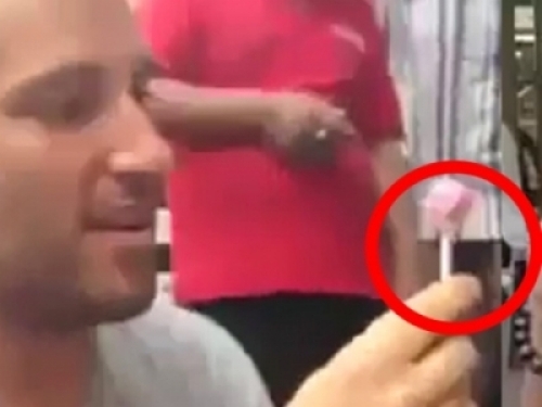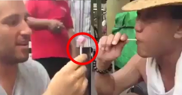 奇怪!不是我買的棒棒糖嘛!怎麼變成阿伯在吃!阿伯吃了一段時間後,再次把棒棒糖拿出來時,男子整個傻了!