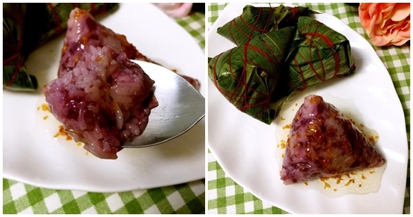 今天嘗試著用紫薯做餡,切小丁后炒香了,混在糯米里,做出來的粽子還是很好吃的。