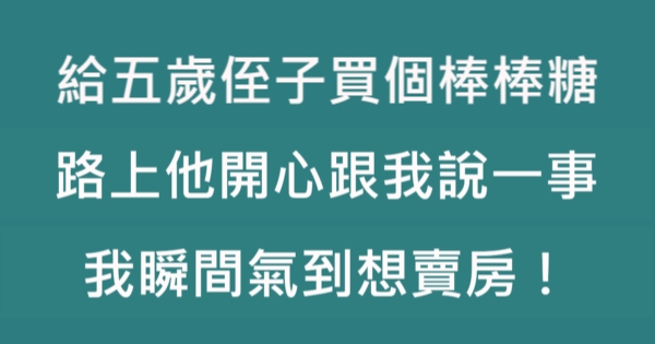 哈摟哈摟親愛的大家~~我是有錢人這麼想小編Pineapple!今天要來說說關「給五歲侄子買個棒棒糖,路上他開心跟我說一事,我瞬間氣到想賣房!」的事件!讓我們一起來看看吧!