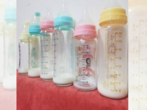 只見畫面中有一排大小不一的奶瓶,