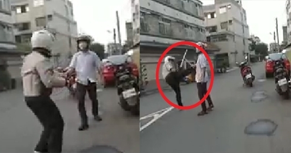 屁孩年輕人正想要繼續拿木棍嚇阿伯,木棍揮過去,阿伯都用手擋攻擊,不過屁孩卻沒有想要鬆手的意思,一直逼著阿伯只能後退,下一秒,阿伯就突然來個轉身飛踢,當場把屁孩的木棍踢成兩半,屁孩看不對勁落荒而逃!