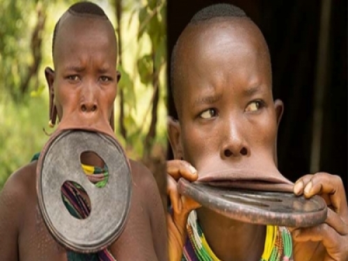 摩爾西族女人把下嘴唇拉長透空,用泥做的盤子填充支撐,
