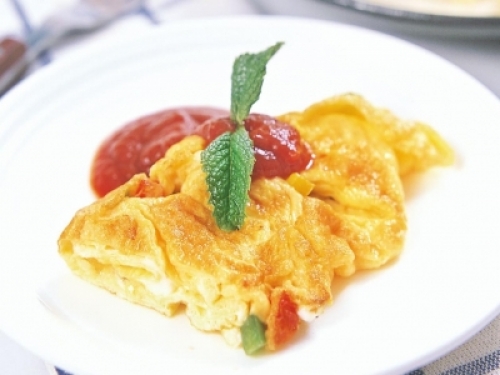 準備材料:雞蛋 3 個,洋蔥丁 30 克,番茄丁 30 克,青椒丁 30 克,香菇丁 30 克,羅勒葉 1 枝,番茄沙司、鹽、胡椒粉、橄欖油各適量