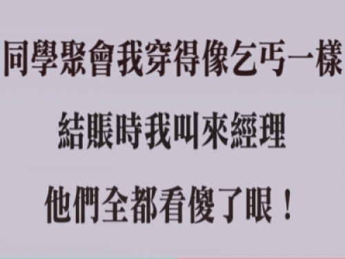 那些吹噓自己多有錢的人此時也都按兵不動,我看到一個服務員經過,就讓他把經理叫來,那個服務員狐疑看著我,最後還是去了,同學們也跟那個服務員一樣的表情。