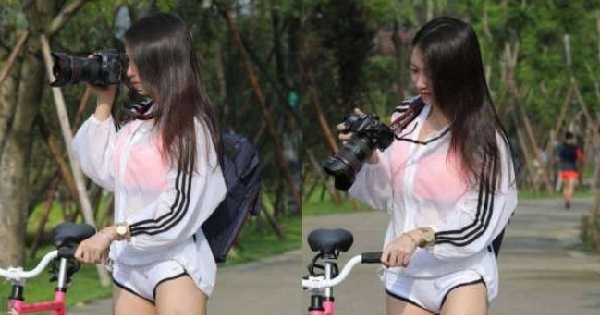 只見正妹一手推著腳踏車一手拿著相機在公園裡走動,
