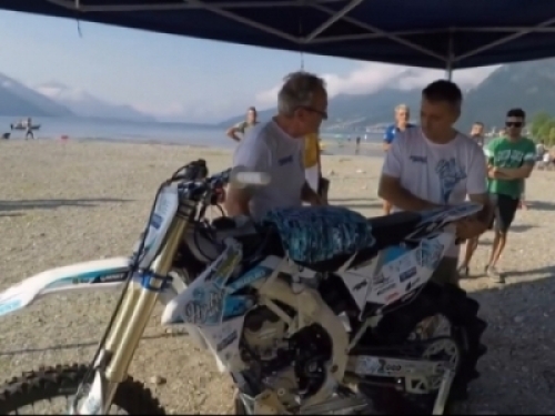 路卡的這台機車是SUZKI RM-Z450的越野車,當然啦!可是有經過大幅度的改造,輪胎改造成能夠在沙地行使的特殊輪胎,還在兩側加上浮板,讓路卡可以在水面上控制方向!這台機車改裝後可是有230公斤重,真的很難想像那麼大台的車竟然可以在水面上移動!