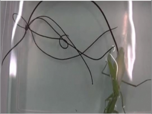 其實寄生在螳螂的寄生蟲為「鐵線蟲」!卵內幼蟲孵出以後,便會進到螳螂、蟋蟀等昆蟲的體內發育成稚蟲!