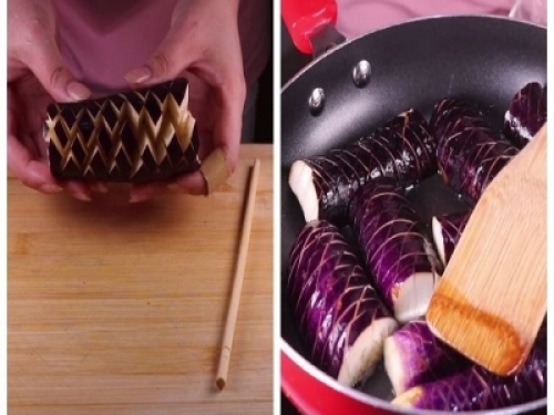 9、這裡我們可以藉助筷子來固定住茄子的一端,這樣我們在切茄子的時候就不容易將茄子切斷了。