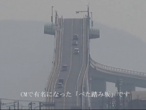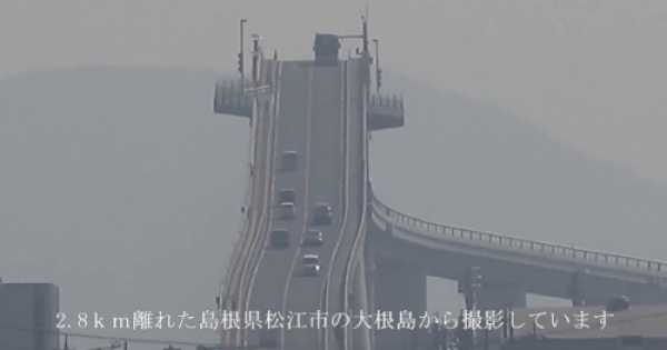 這座大橋就位在日本,連接了烏取縣境港和松江的江島大橋,全長總共有1.7公里,雙向只有一線車道,這樣聽起來好像跟一般大橋沒什麼兩樣,但重點是這座橋的坡度真的超級陡,影片一PO上網,網友全傻了:這比雲霄飛車還恐怖啊!