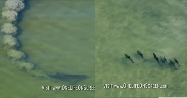 攝影機拍到一群海豚不斷用尾巴拍打海面,覺得納悶!過沒幾秒眼前竟浮現「這畫面」所有人都被海豚的高智商給震撼到說不出話來!