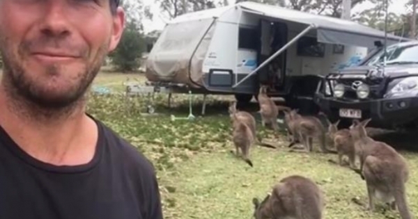 他心血來潮露營時切了片蘋果請袋鼠吃,沒想到隔天竟看到一大堆袋鼠跑來排隊討吃!