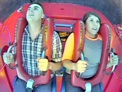 一開始兩個人都很興奮地搭乘雲霄飛車,女生看起來很緊張,男生則是一臉無所謂的感覺,好像天不怕地不怕的!