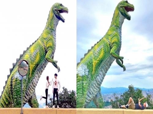 除了這隻網友瘋拍的巨大暴龍,在附近也有其他五種不同品種的恐龍雕像,大家有去的話也別忘了與她們合影喔~