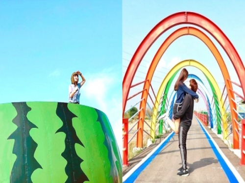 「龍井區堤防自行車道」全長約5.3公里,沿途騎在堤頂,高高的視野看出去相當遼闊、寬廣,沿線還有設置許多觀景台,是設施相當完善的綠廊道~最近引起大家喜歡去拍拍的點,就是途中有一個巨型西瓜座椅和繽紛彩虹橋,拍起超來可愛的啦~