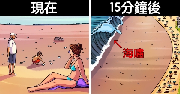 當海岸上曾有水拍打過的痕跡,但海浪又退得很遠時,代表可能有海嘯的徵兆。2004年南亞大海嘯時,很多人沒注意到這個現象,反而開心地去撿海岸上露出來的貝殼和魚。那時海灘上只有2個人知道危險將至:一個是10歲的英國女孩Tilly Smith,和一名生物老師John Chroston,他們急著奔走警告大眾,挽救了許多人的生命。