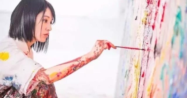 1分鐘後她站起身,將飽蘸色彩的筆
