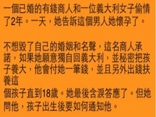 一個已婚的有錢商人和一位義大利女子偷情了2年。一天,她告訴這個男人她懷孕了。