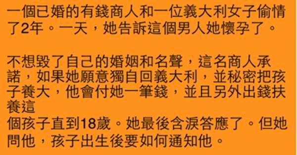為了不讓事情曝光,他告訴她,孩子出生後,就寄一張明信片給他,背面寫上「義大利麵」,他就會開始固定匯錢給她。