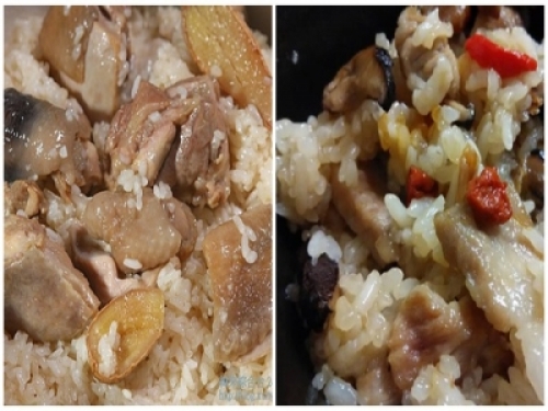 放入切片香菇、小雞腿、薑,倒入兩湯匙麻油,外鍋一杯水,開關跳起後燜15分鐘。