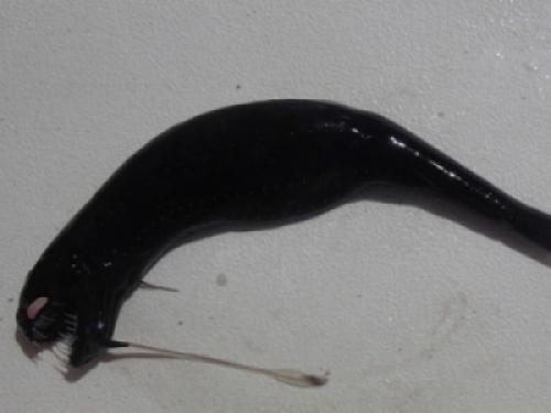 日本一女子在室戶市的一海灣裡發現這樣一幕,在海灣的一地面上佈滿了大量的黑色怪魚,這些怪魚的長相非常奇怪,其通體發黑,嘴巴巨大,長著尖銳的牙齒,下顎的觸鬚上有發光器,長相頗為凶惡,看著讓人不安。