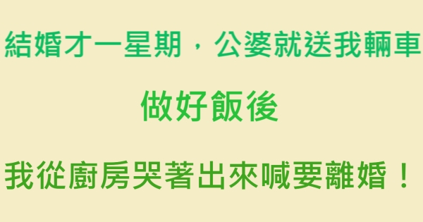 結婚才一星期,公婆就送我輛車,做好飯後,我從廚房哭著出來喊要離婚!