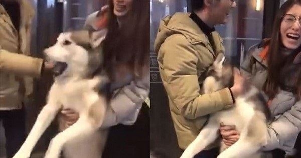 可以看到,求愛失敗的哈士奇因為受到打擊,整隻狗非常不受控,馬麻怕狗兒子做傻事,只好從後方架住牠。