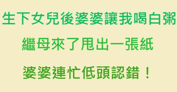 生下女兒後婆婆讓我喝白粥,繼母來了甩出一張紙,婆婆連忙低頭認錯!