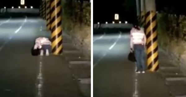 這名蔡姓網友15日在臉書「爆廢公社4.0」貼出影片,一位身穿白衣、牛仔褲的女子,在外埔甲后路上朝大甲方向前進,沿途中進行三步一跪一拜的儀式。