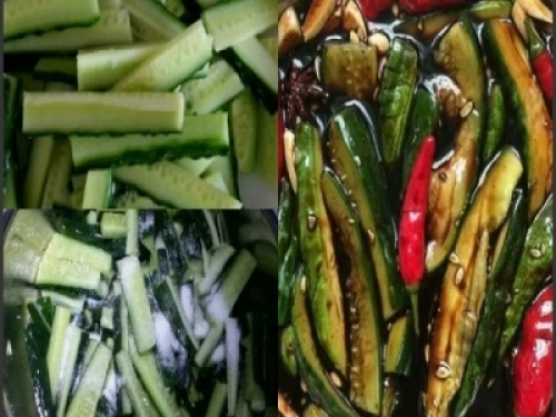 第一步,首先將黃瓜清洗乾淨控干水,然後把將黃瓜用刀切成細條,撒上少許食用鹽,先腌制3個小時