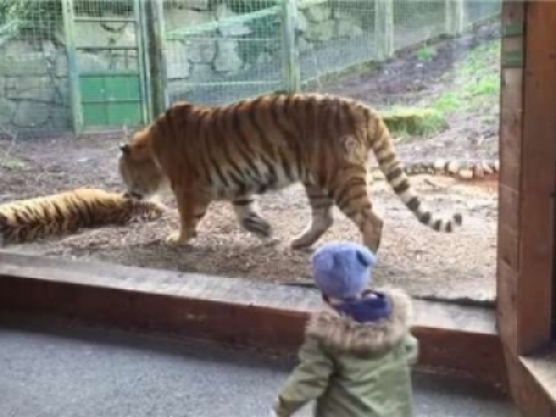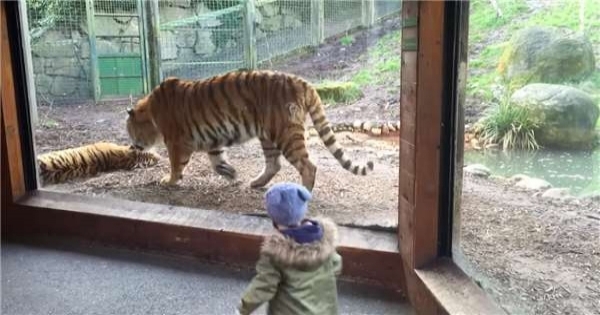 近日在愛爾蘭的都柏林動物園,遊客在老虎園區錄下一段有趣的畫面。一個孩子正在玻璃前看著老虎從領地走出,並緩緩向在睡覺的同伴走去。