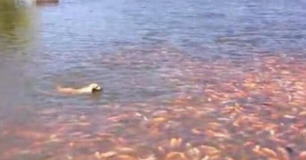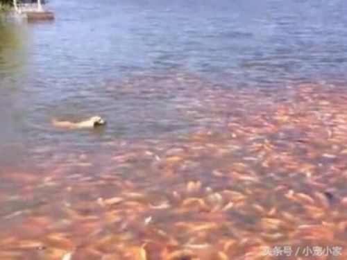 看著如此多的錦鯉,拉布拉多也開始不淡定了,趕緊往岸上游,看著自家拉布拉多這樣子主人也是相當無奈。