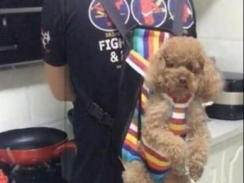 就這麼過了一個月後,泰迪馬上就把我老公征服了,現在老公寵它們比寵我還多,有一次下班回來的時候看到老公背著一隻泰迪,手裡還抱著一只在炒菜,我說這樣不怕它們摔倒嗎。老公笑嘻嘻的說:沒辦法呀,兩隻小傢伙總是粘著我,不抱著都不讓我好好炒菜。