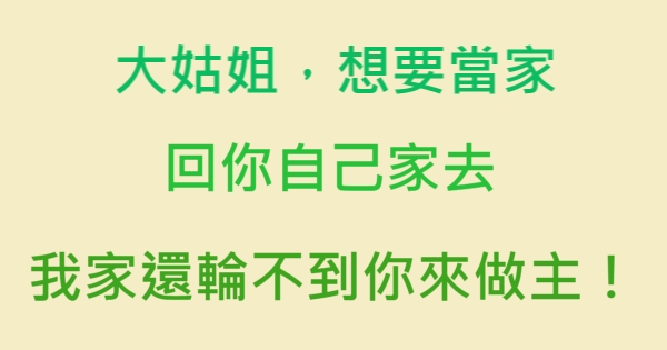 我本來對她就有很大意見,現在她還想當我們的家,想做我孩子的主,我自然就覺得非常生氣,後來跟她發生口角,我直接對她說道:"大姑姐,你想要做主就回你自己家去,我家還輪不到你來做主!"