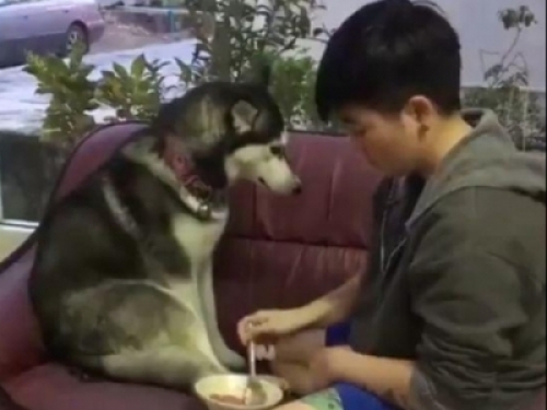 狗主人給哈士奇說了很多好話,但是二哈還是不理他,最後他只好使出了殺手鐧,那就是拿出了二哈最喜歡吃的肉肉,還親自用勺子一勺一勺給二哈餵。