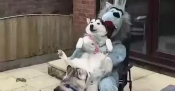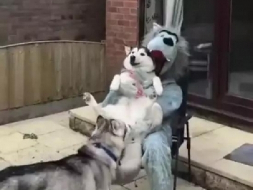 就比如這次,網友就裝了一個大野狼的服裝跟兩隻哈士奇一起玩,他還抱著其中一隻二哈一起玩,二哈在主人的懷裡顯得是非常緊張,到了最後才露出了一絲微笑。