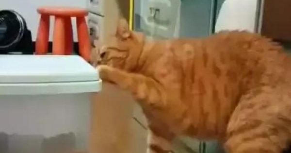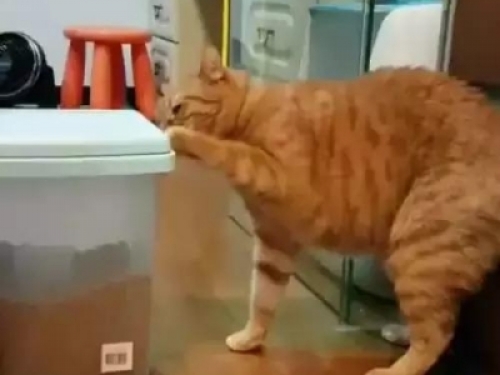 後來,鏟屎官無意中拍到了這一幕,這下他終於明白橘貓為什麼越來越胖了。原來,這只橘貓總是趁鏟屎官不注意的時候去偷貓糧,它來到貓糧儲糧桶前,很熟練地打開了儲糧桶的蓋子,然後把腦袋伸了進去。