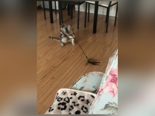 主人沒空逗貓,瞧把它給孤獨的,但是這都沒關係,虎斑貓可以自己拿起逗貓棒,用嘴咬著桿,自己逗著自己玩。做寵物做到這份上,也是很勵誌了。