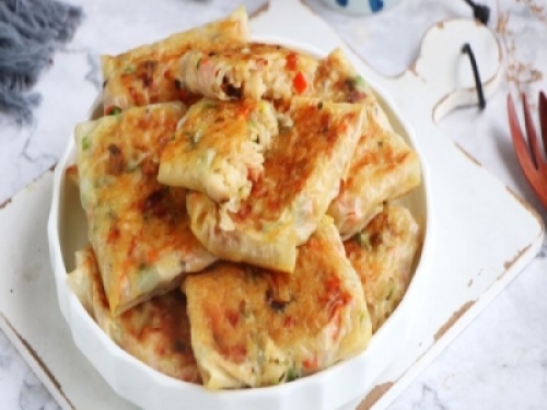 7、平底鍋刷一層植物油,放入餃子皮剩米飯,開小火煎至兩面金黃色即可;