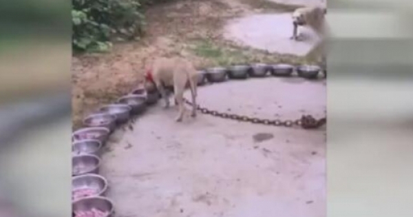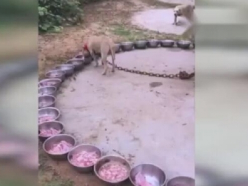 不過主人也不要這樣做了,雖然這些狗狗都不會鬆開鐵鍊,但是其它的狗也已經口水都流完,別的狗看到這麼多肉,肚子已經超就餓的受不了。