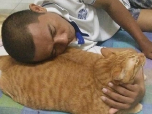 相信大家看完都想去試試自家的橘貓吧,不過友情提醒的是,乖乖當枕頭的是別人家的貓,脾氣好一點的貓是可以這樣玩,要換做暴脾氣的貓主子,估計還沒有睡著呢,臉上就多了幾道抓痕了……